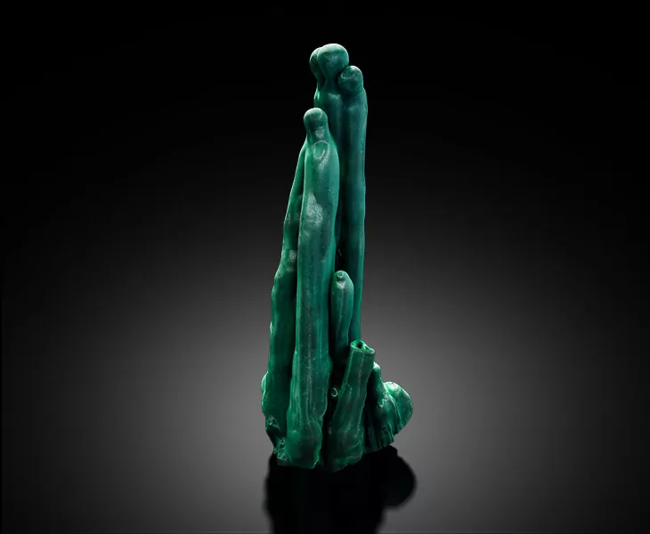Most malachite forms in large slabs and is cut into blocks. This gorgeous specimen is distinctive as an elegant, elongated cluster of intergrown, malachite stalactites. It exhibits a sumptuous, rich-green color that is paired with a delicate sheen. Thanks to the malachite’s dense structure and its luster, the specimen has a lush, velvety appearance. The stalactite crystals of this piece are impeccably formed and each one features slight bends, folds, and bulges that are so subtle and fluid, it makes this inorganic structure mimic living sea-life, growing and bending with the waves. Some of the shorter stalactites even feature open cavities that are fully terminated and smooth, adding to its similarity to corals.